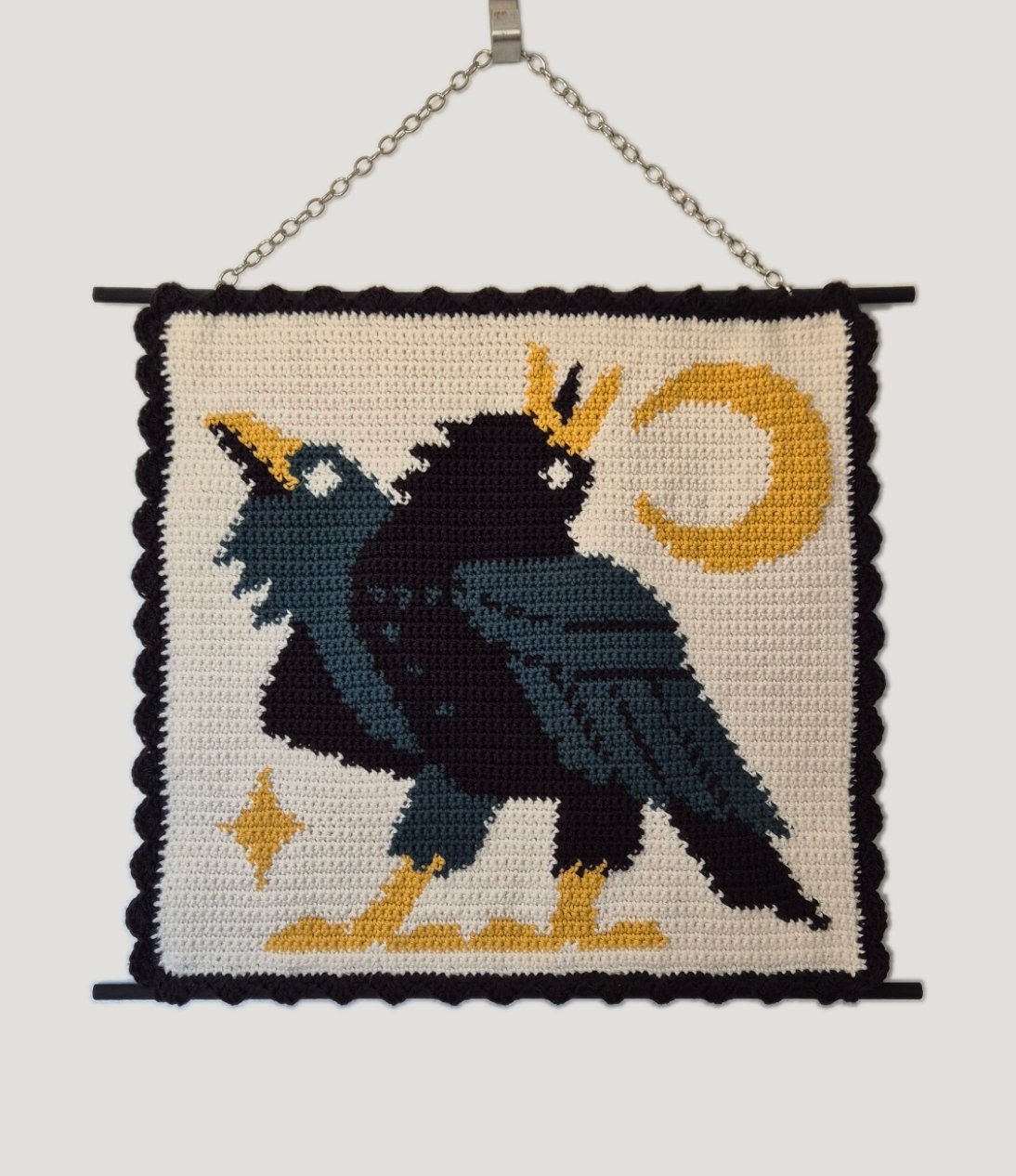 This one of a kind two headed crow tapestry has been lovingly crafted with 100% cotton yarn. Finished with black wooden dowels and a shiny silver chain.
